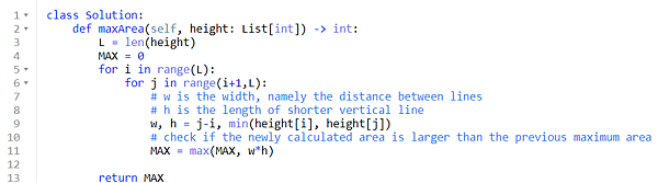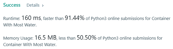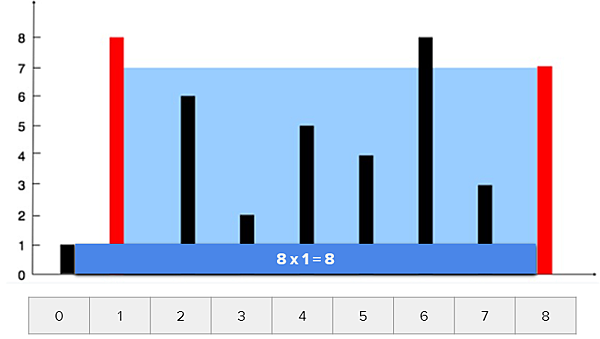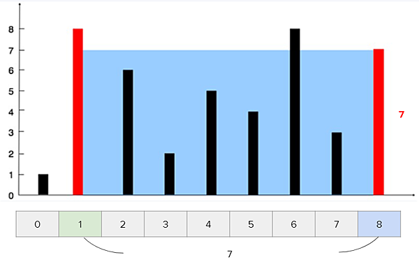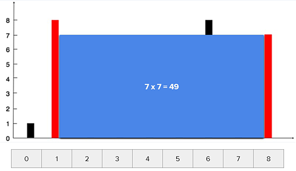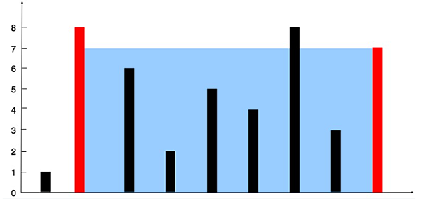 Explanation: The above vertical lines are represented by array [1,8,6,2,5,4,8,3,7]. In this case, the max area of water (blue section) the container can contain is 49.