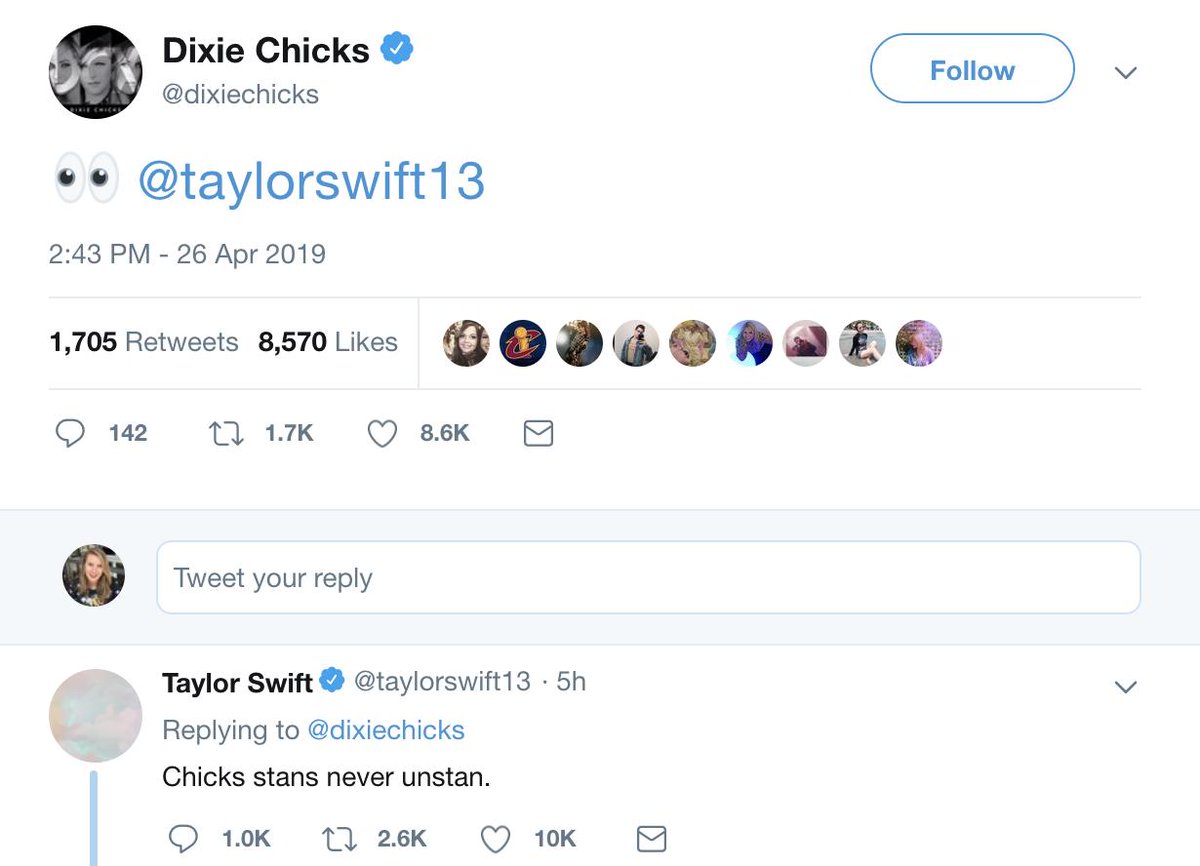 看到這則 tweet,很多粉絲都猜測 Taylor 未來有可能會和 The Chicks 合作~